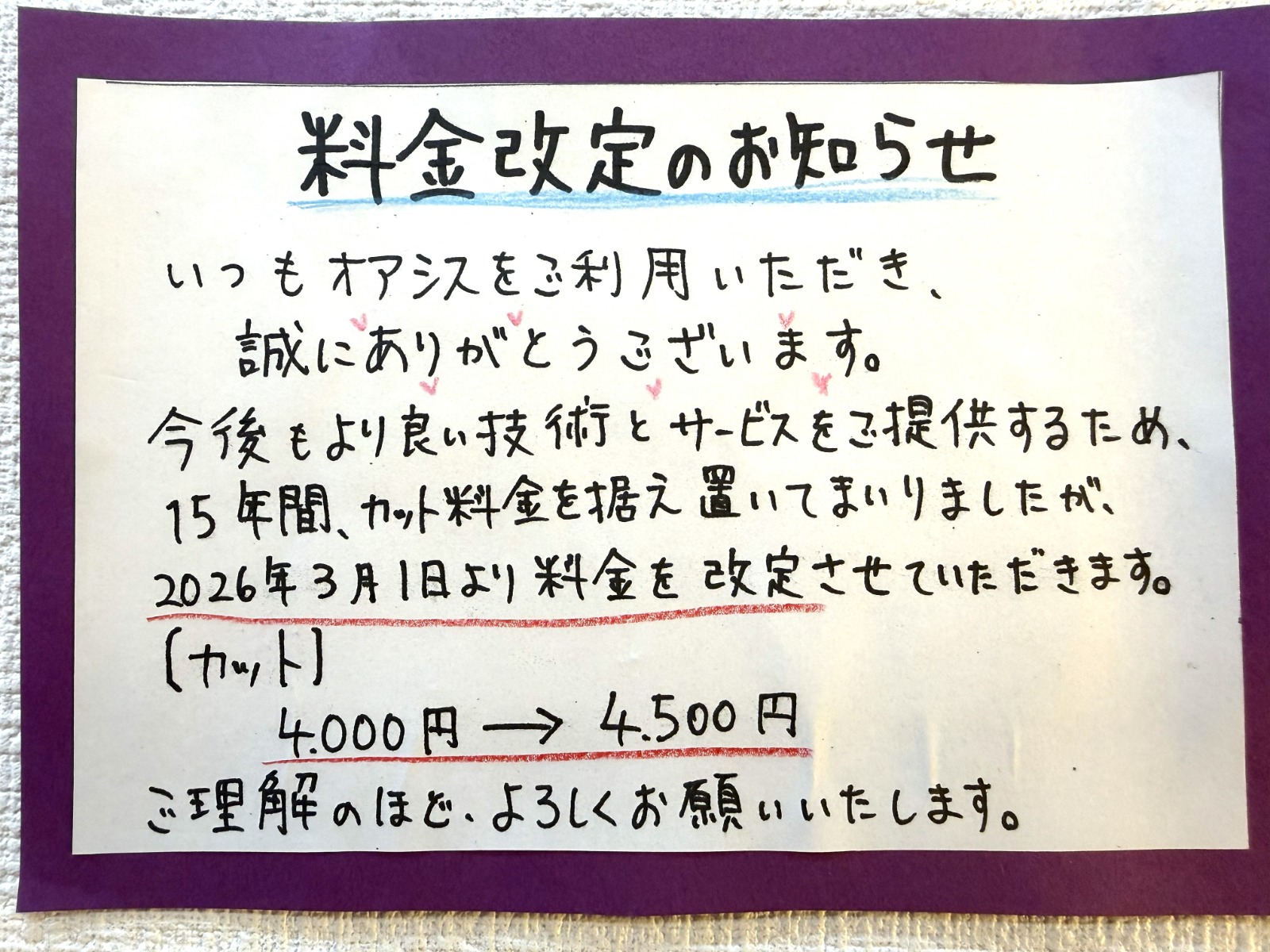 15年間カット料金を据え置いておりましたが、今後もより質の高い技術とサービスを提供するため2026年3月より料金を改定させていただきます。